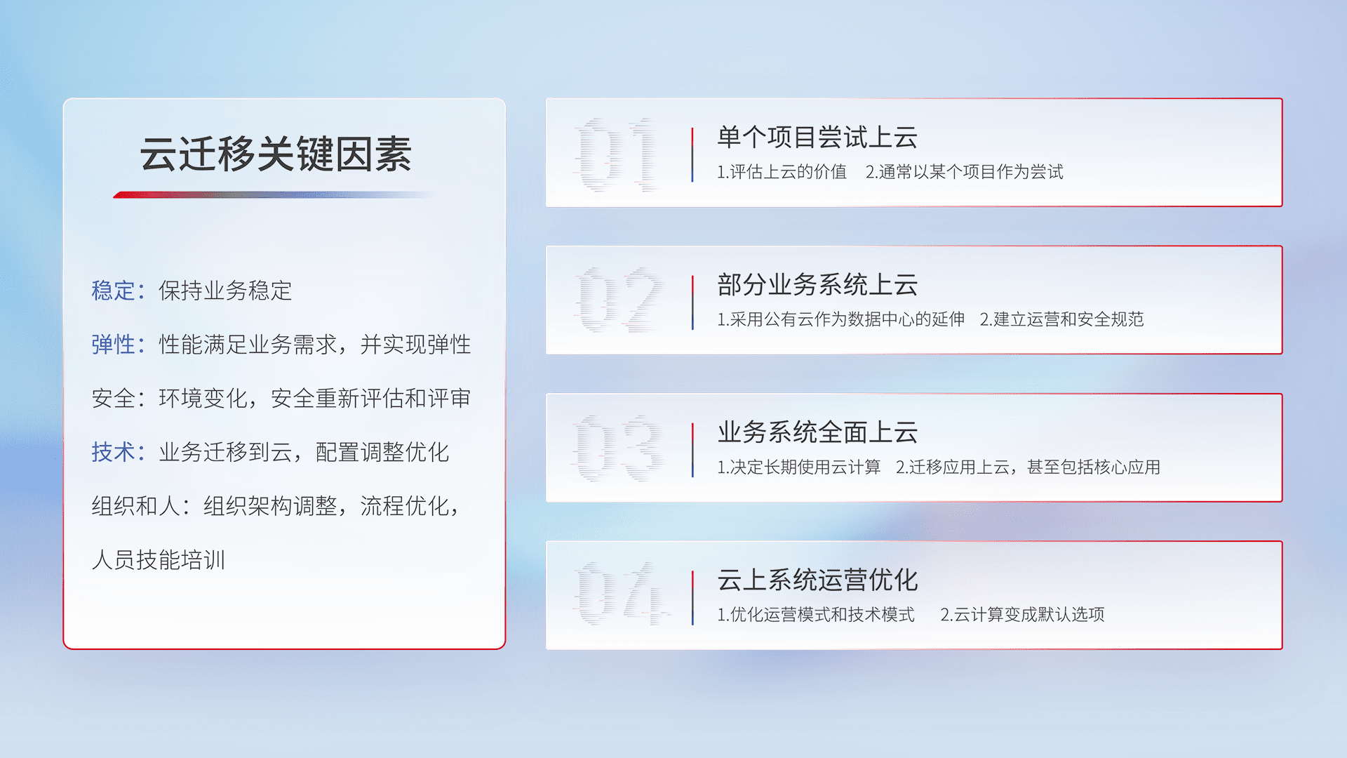 结合实际业务,,,从规划设计、、、云平台选型、、云原生改造、、、、数据迁移、、、、集成交付,,迁移全过程为客户识别最佳上云路径,,做好风险识别管理,,,,设计网络架构、、、、身份权限、、、、安全审计合规、、、、操作审计、、日志审计、、、监控告警策略、、多站点容灾设计等,,,,对云上基础设施进行整体规划,,,提升IT治理水平,,,,以满足弹性、、高可用、、、高性能的需求。。