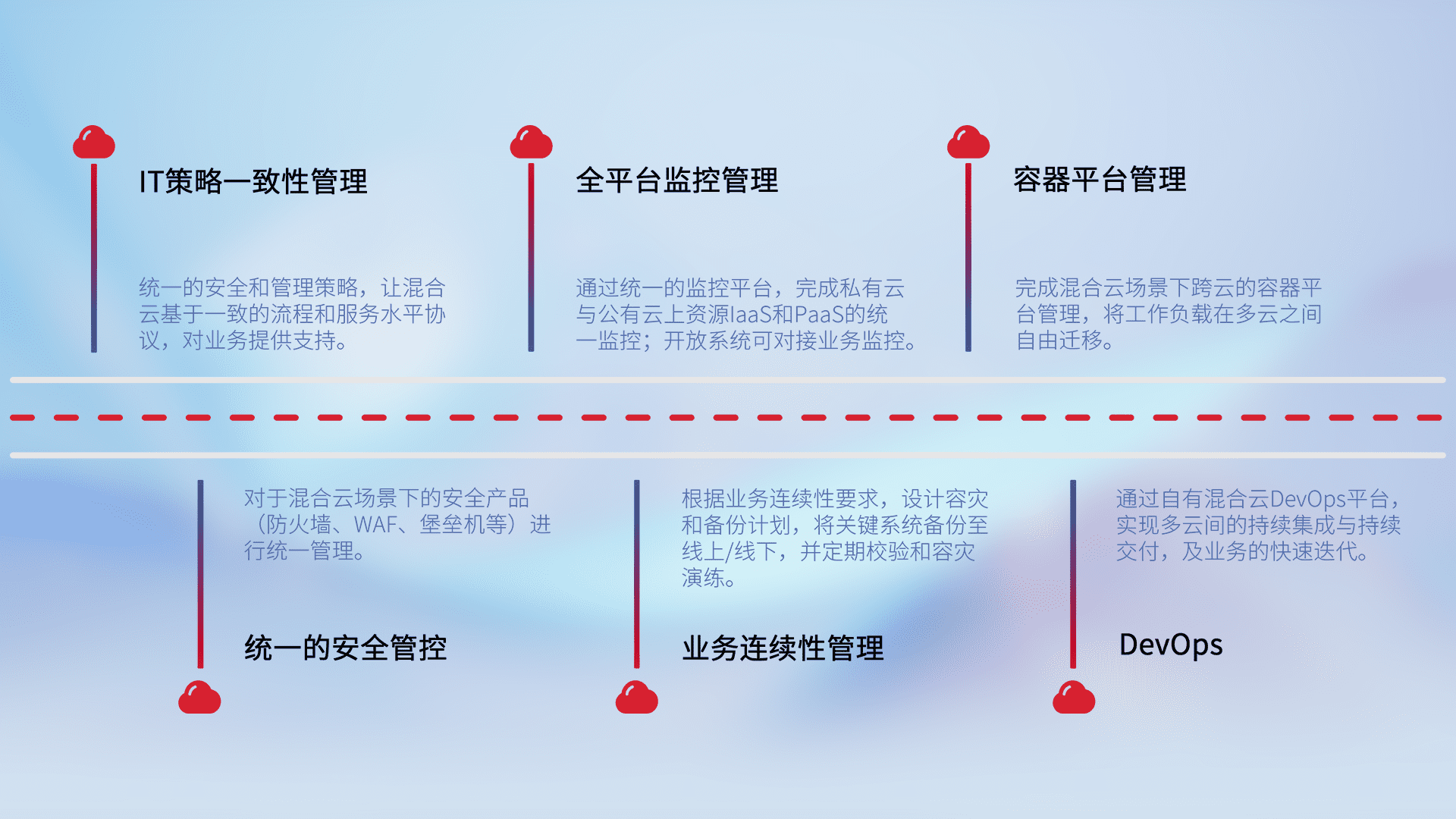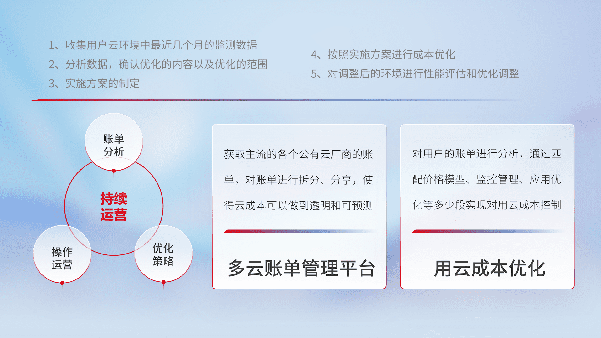 通过多云纳管,,以统一的资源数据模型把客户的云资源进行抽象和封装,,进而实现对多云资源的统一操作,,保障云资源管理的可靠性、、、、稳定性与可用性。。。。量身定制化运维内容,,,,配置、、开发运维、、、、补丁管理、、备份、、、监控、、、、认证和访问管理、、、、审计和日常巡检等,,,,保障在用云过程中的可靠度,,,稳定度以及高可用率。。。