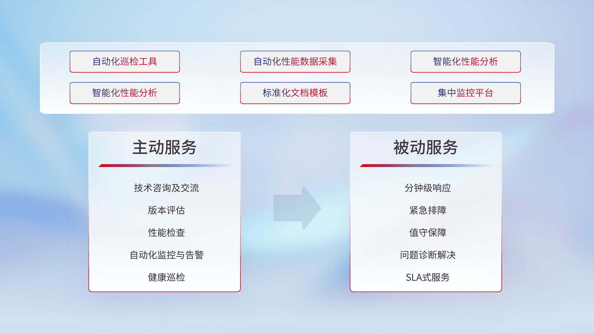 智能化工具和标准化文档,,保障服务质量,,,,提供主动服务(包含技术咨询、、版本评估、、性能检查、、、、自动化监控与告警、、健康巡检)和被动服务包含(分钟级响应、、、紧急排障、、、、值守保障、、问题诊断解决、、、、SLA服务)。。。